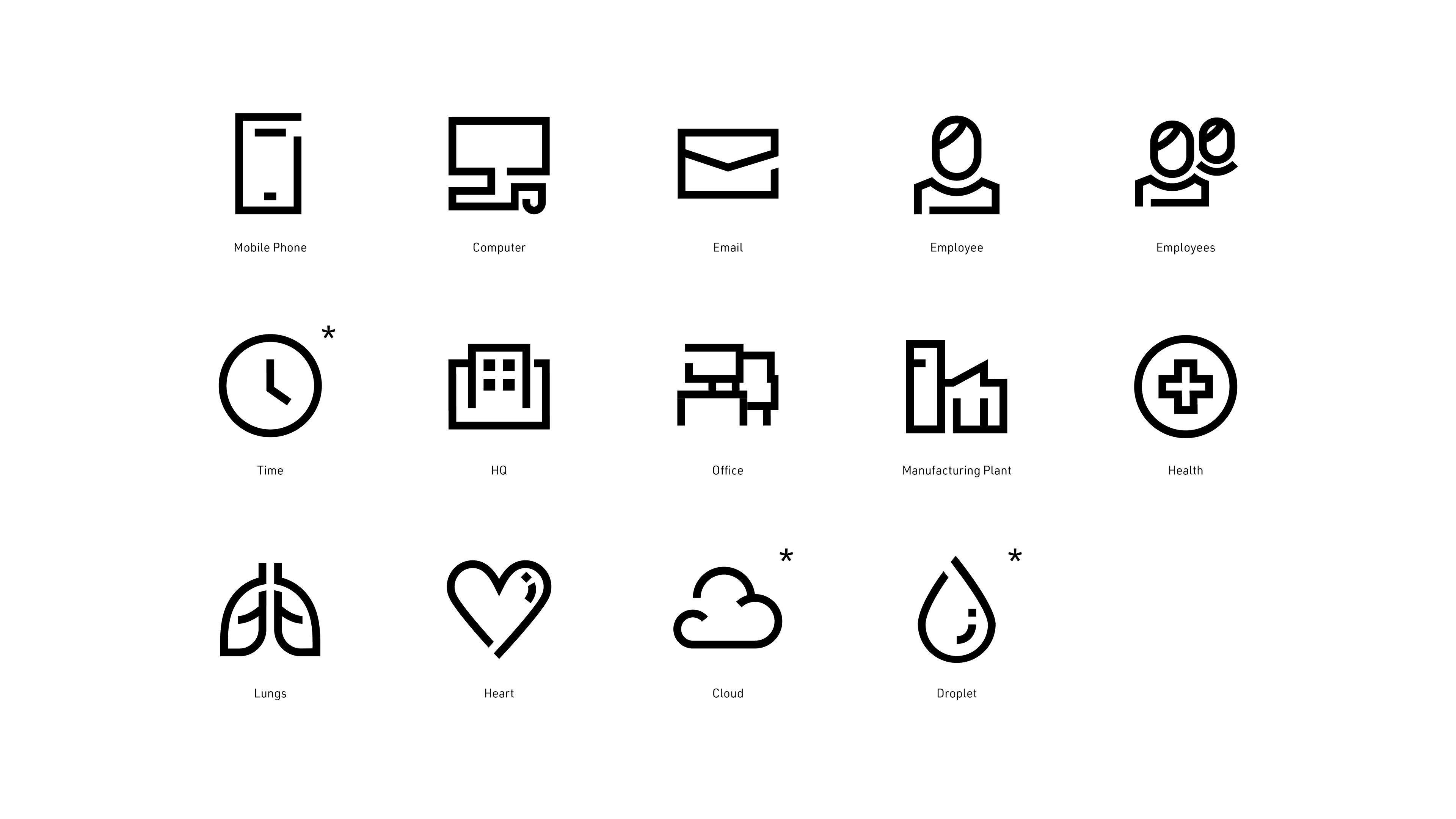 The pictograms marked with asterisks are the original designs provided in the visual identity. I have vectorised them, but not designed them.