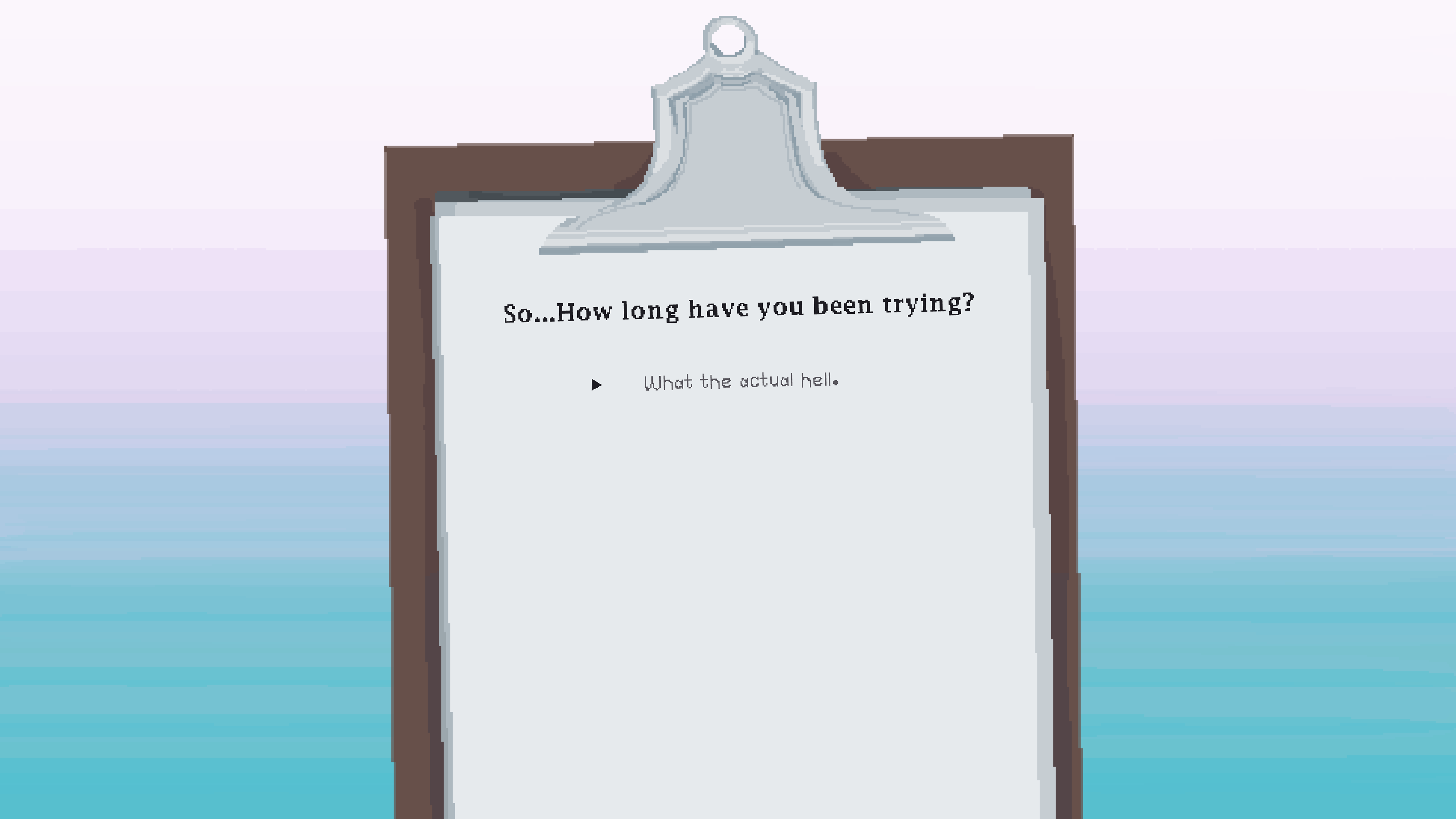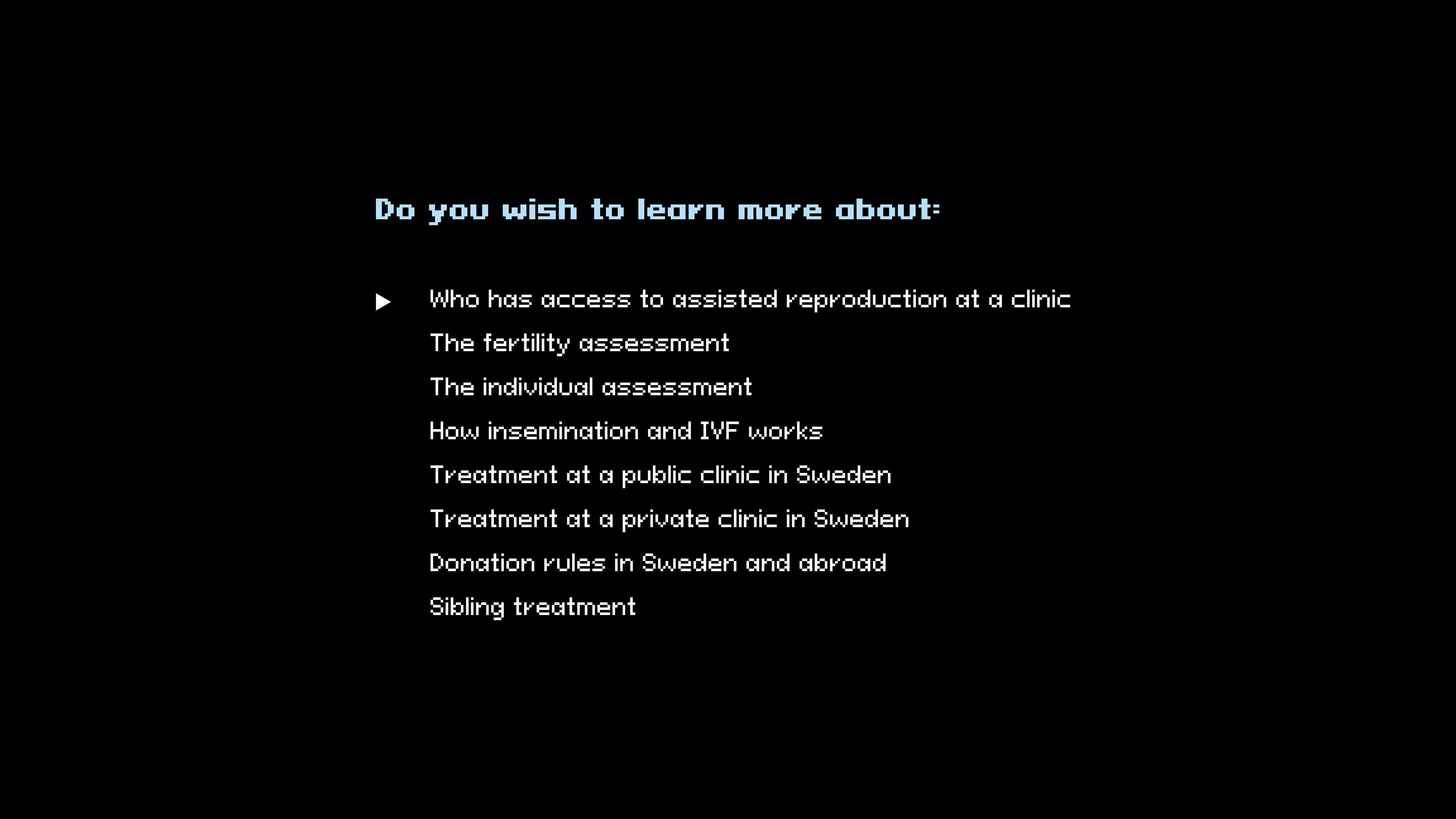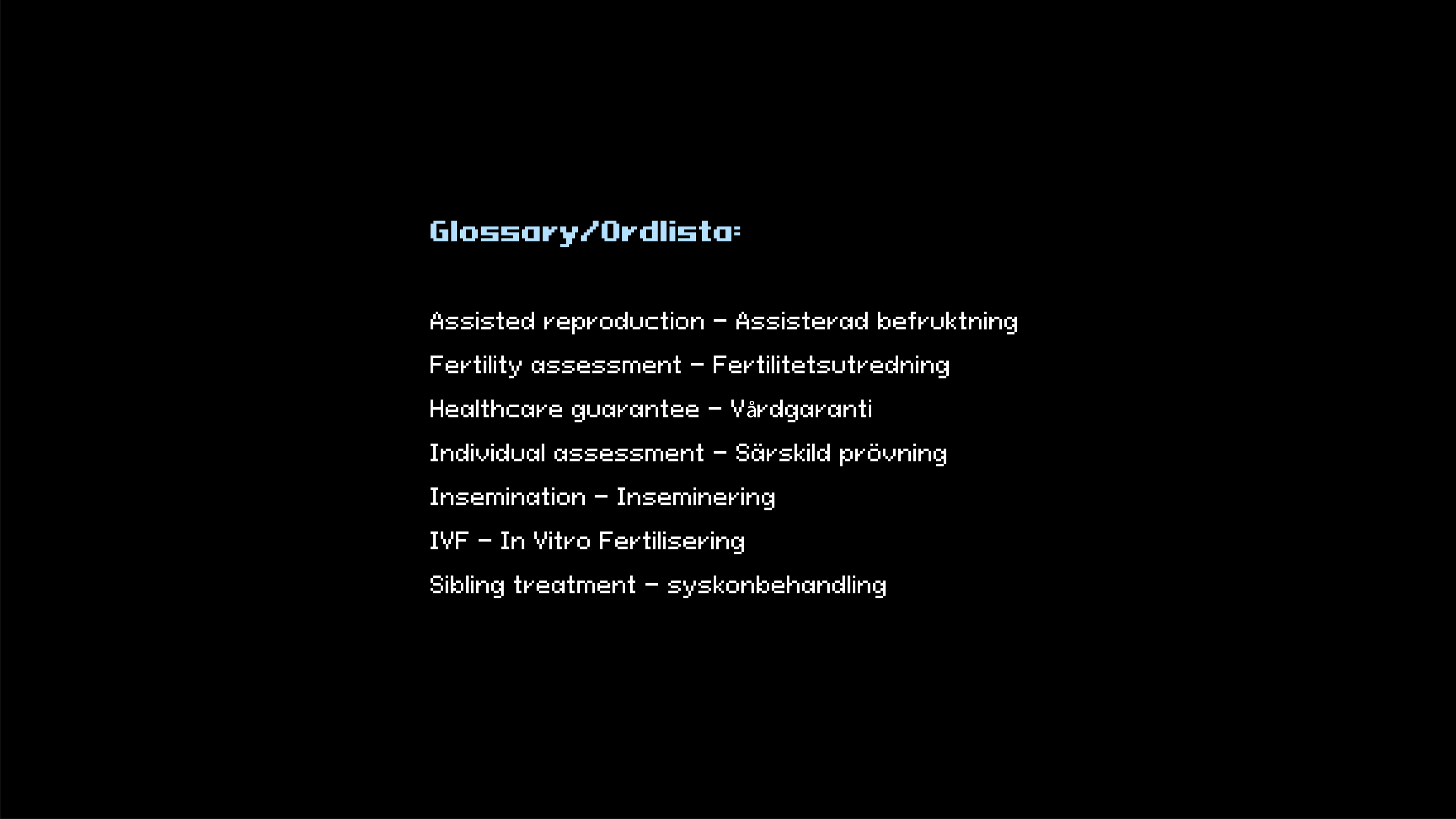 We gave ourselves the brief to portray the process both practically and emotionally through a story driven game. The plot is based on interviews with couples who have personally been through the process and testimonies from queer parent groups online. In order to widen the audience we made the game in English.